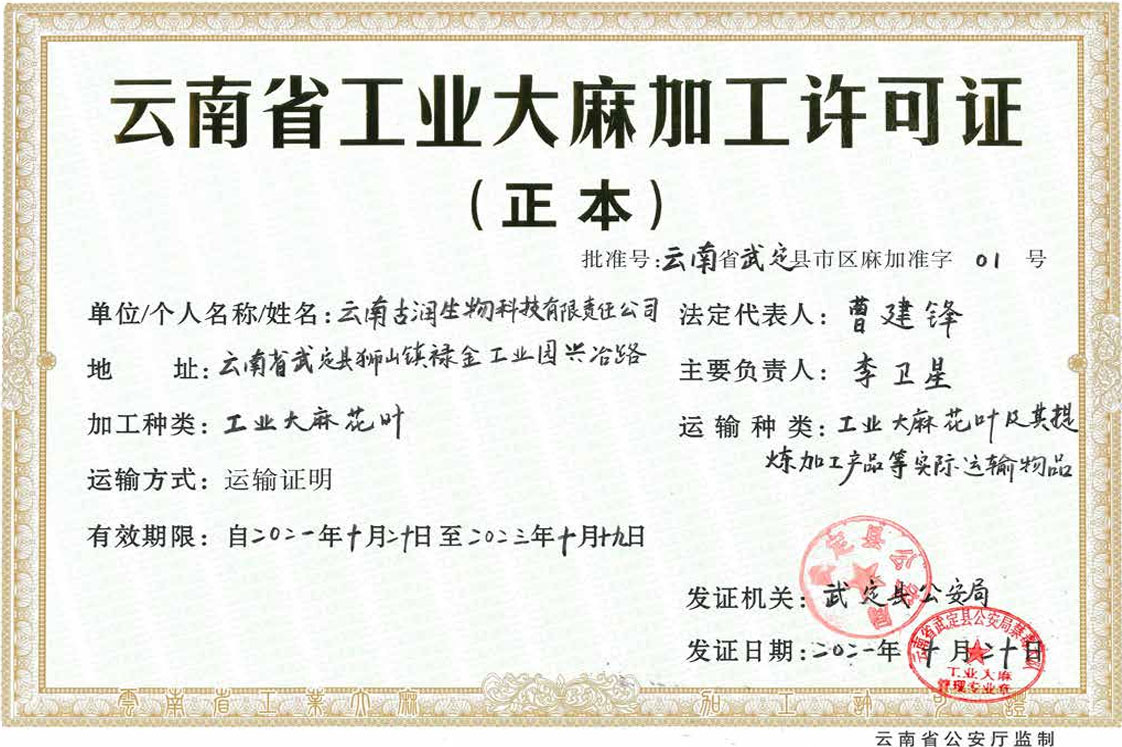 云南古润生物科技有限责任公司是一家专业从事工业大麻提取加工的企业。公司成立于2019年5月24日,选址位于云南省楚雄彝族自治州武定县狮山镇禄金工业园区。公司总占地面积41亩,标准化生产车间3400平方米,综合楼3200平方米,仓库4000平方米。公司专注于工业大麻产品的研究和生产,依托稳定可靠的产品质量和信誉,努力赢得客户和市场的肯定,争取成为行业代表性企业。
